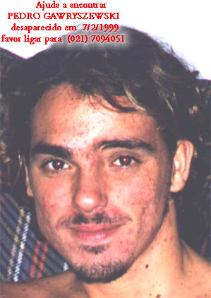Pedro tem 19 anos, � de cor branca com cabelos e olhos castanhos, tem 1,85 m de altura, pesa cerca de 80 kg e apresenta uma cicatriz na sobrancelha esquerda. No dia em que desapareceu vestia camisa creme, cal�a jeans marrom e sapato de camur�a marrom. Luiz G Gawryszewski Professor Adjunto do Departamento de Neurobiologia da UFF [email protected] | |||||||||||||||||||||||